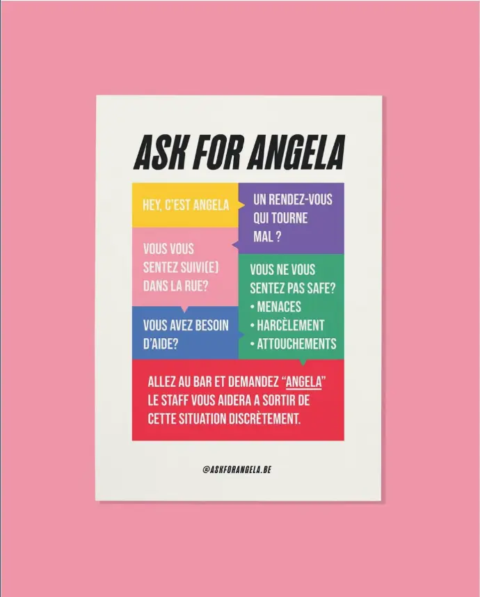 Si une personne se sent harcelée, importunée ou en insécurité lors d'un rendez-vous ou par un autre client, elle peut se rendre au bar et demander si "Angela" est là.